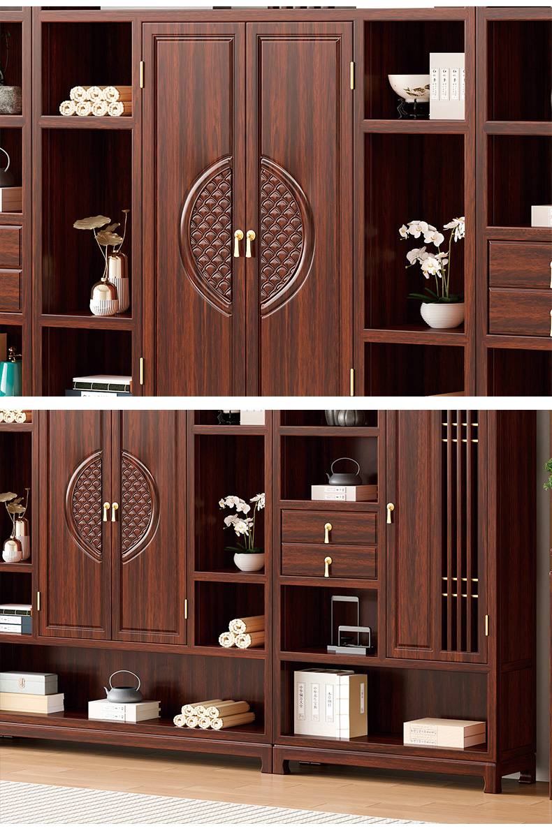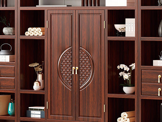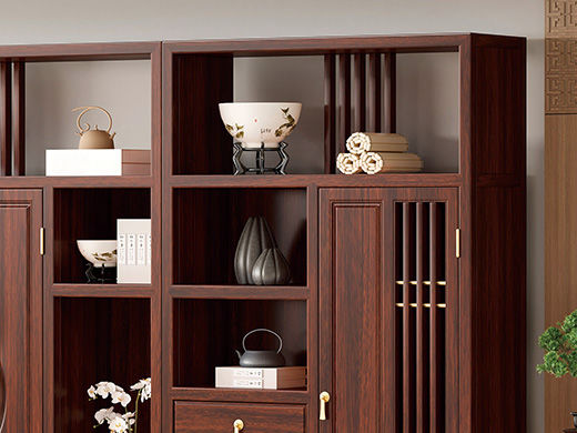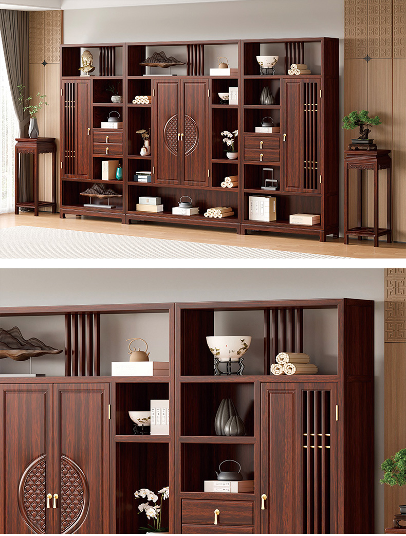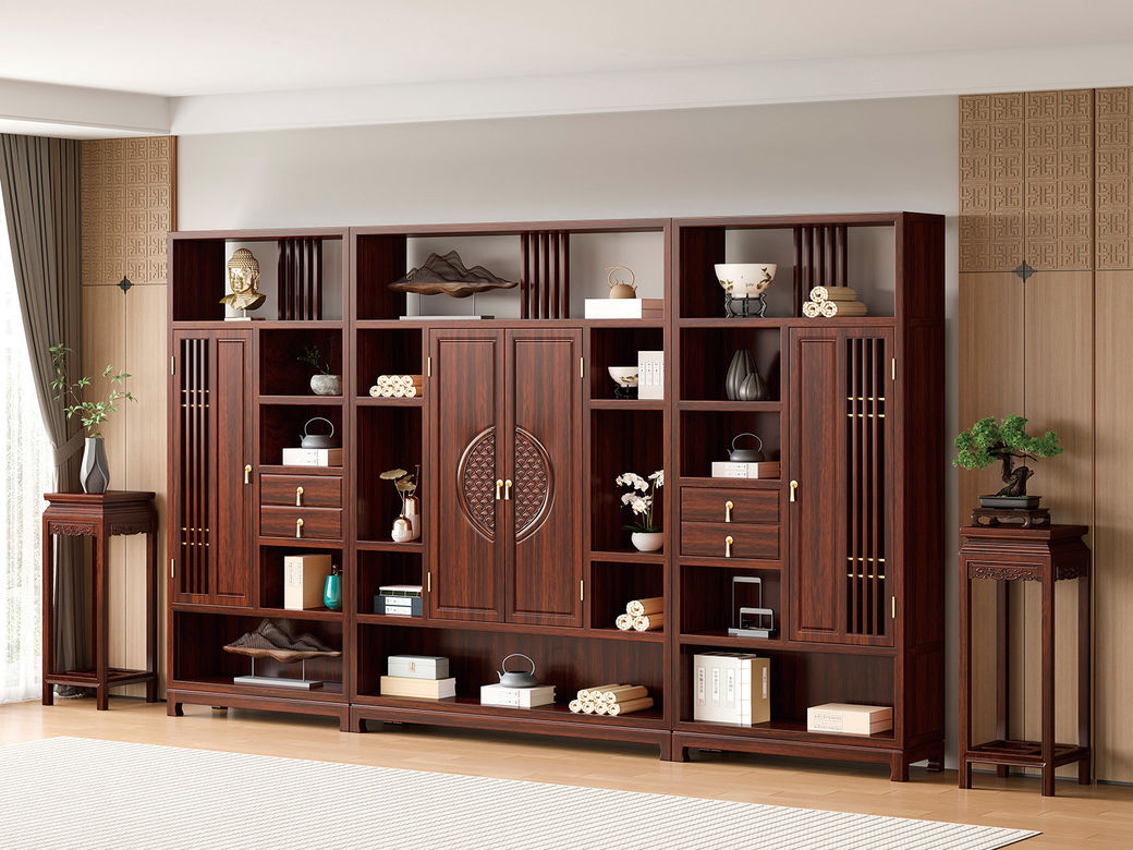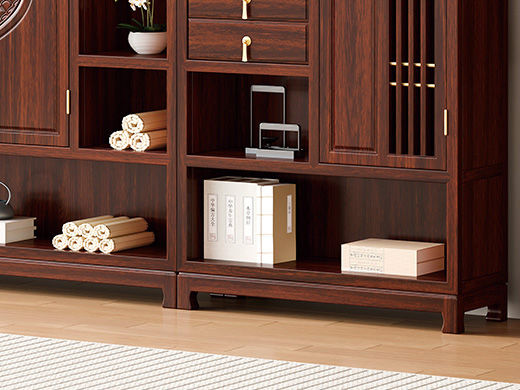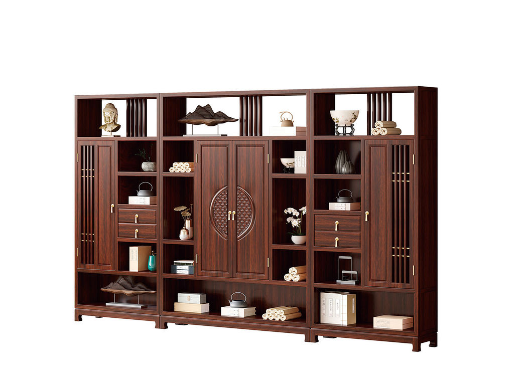 宝瑞·檀风 新中式 印尼金花梨木框架+多层实木板贴皮+电镀五金 紫檀色 三组合书柜