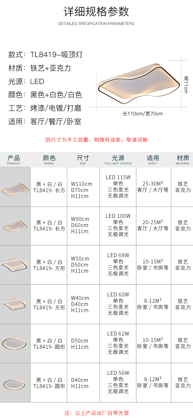 宏光灯饰 极简 铝材+亚克力 LED 90+136W 变光 沙白+沙黑色 长方形吸顶灯¥1822