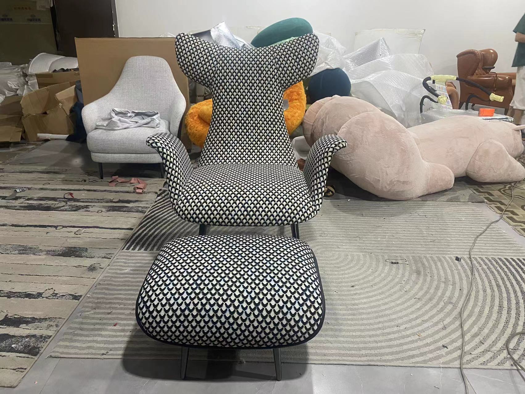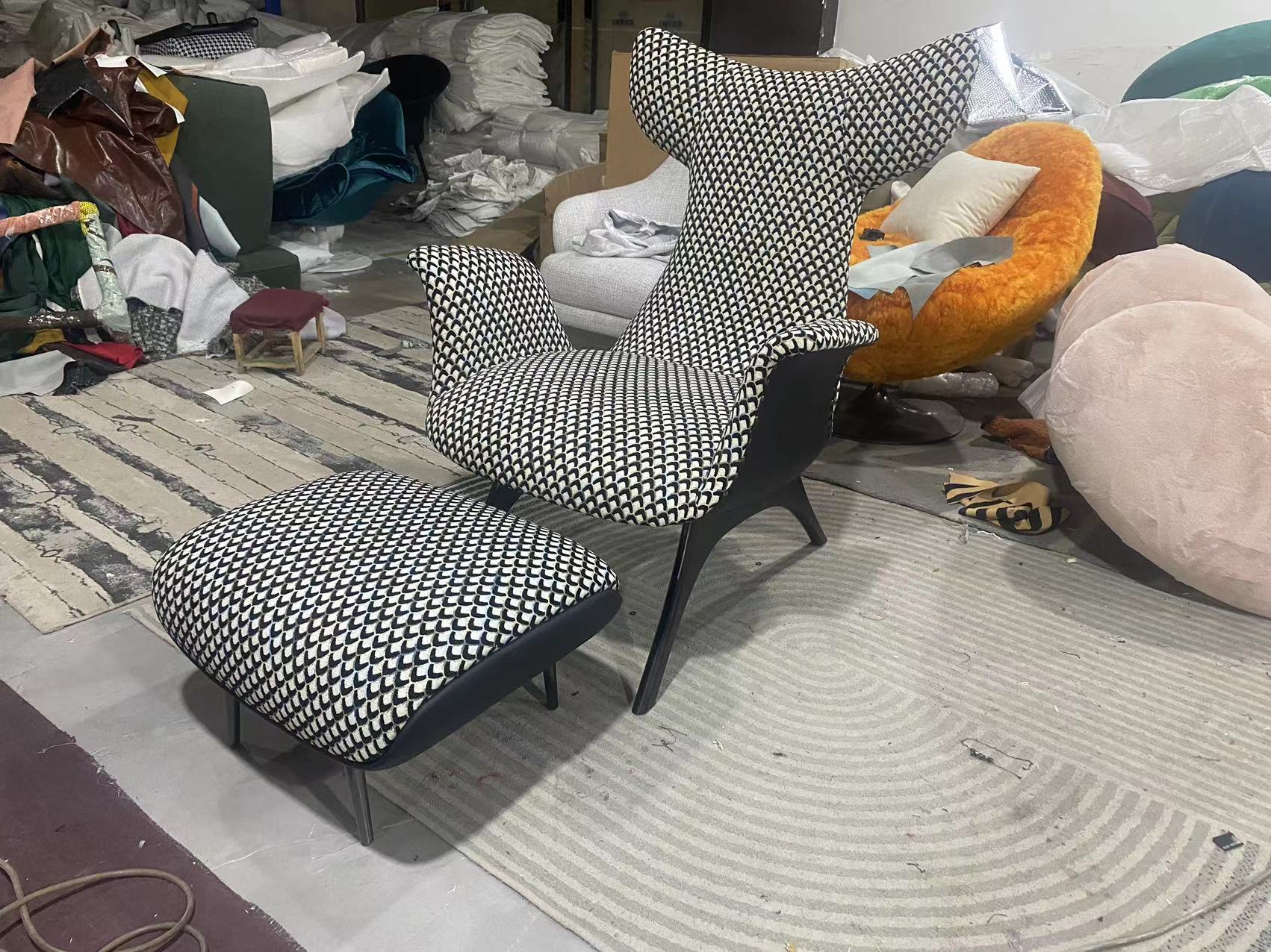 卡芙妮 极简 进口落叶松+进口橡胶木脚+多层实木板+高回弹海绵+蛇形弹簧+彩图布+超纤皮+钛金不锈钢 图片色 休闲椅+脚踏组合