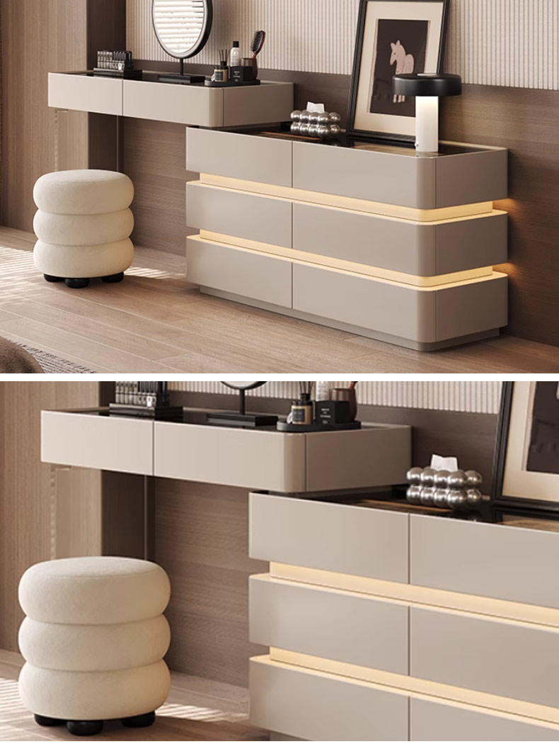 维利品尚 环保烤漆+多层实木框架+实木抽屉+灰不锈钢+云朵触屏妆镜+哑克力妆凳妆凳 1米妆台+边柜+镜子+凳子¥5012