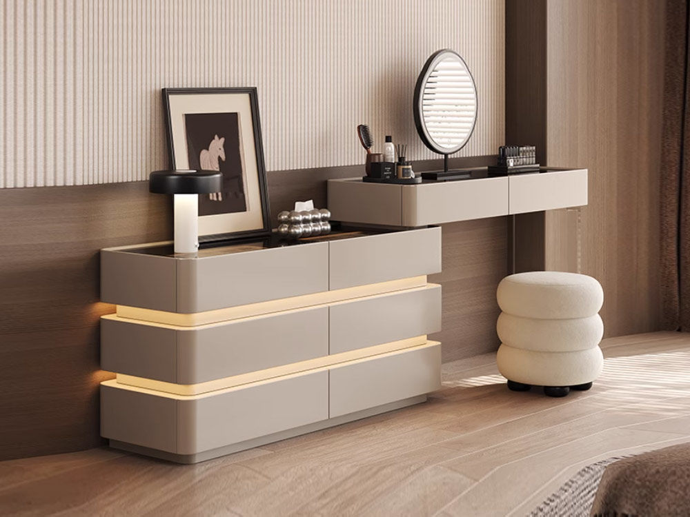 维利品尚 环保烤漆+多层实木框架+实木抽屉+灰不锈钢+云朵触屏妆镜+哑克力妆凳妆凳 1米妆台+边柜+镜子+凳子