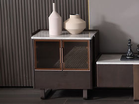 梵歌 现代简约 E1环保中纤板 环保水性漆 烟熏木皮 高密度三胺板抽屉+三节缓冲导轨 抽面3MM岩板+15MM人造大理石面 碳素钢五金脚 烟熏色【边柜】
