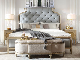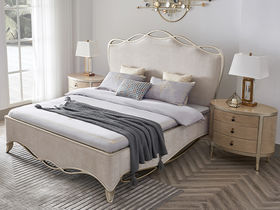 艾美侈 美式 进口榉木+布艺软包+实木雕花块+实木床板 香槟银 1.8米皇帝床