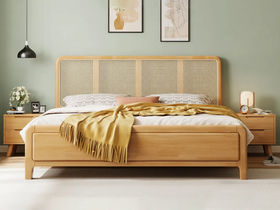 简森曼 北欧风 床头床尾脚为橡胶木靠背为编藤 原木色 1.8米床 【实木拼接工艺】