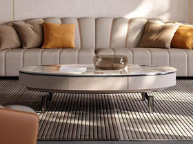 小红书系列 现代 茶几:胡桃木皮柜身+马鞍皮双抽+不锈钢底架+罗曼蒂克石面 边几:马鞍皮面板+不锈钢底架 0.9米组合茶几
